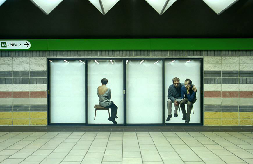 Otto pannelli fotografici posti lungo le vetrine del passante ferroviario. I soggetti sono gruppi di figure su fondo bianco che compiono un’azione. L’insieme di tutte queste azioni forma un unico racconto. La relazione da una “formella ” all’altra è stabilita da un gioco di sguardi tra le persone fotografate con un rimando a ciò che avviene all’esterno dell’immagine.